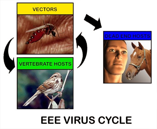 But just because they feed mostly from birds doesn’t mean they aren’t important disease transmission. They are – for horses. Eastern equine encephalitis virus is passed from bird to bird by C. melanura, so the birds, especially cardinals, are a reservoir of virus. Then, when another species of mosquito that is less particular about its host species bite a bird then bites a horse or person, the disease can be spread. There are even cases where a C. melanura will occasionally feed on a human and spread the disease directly.