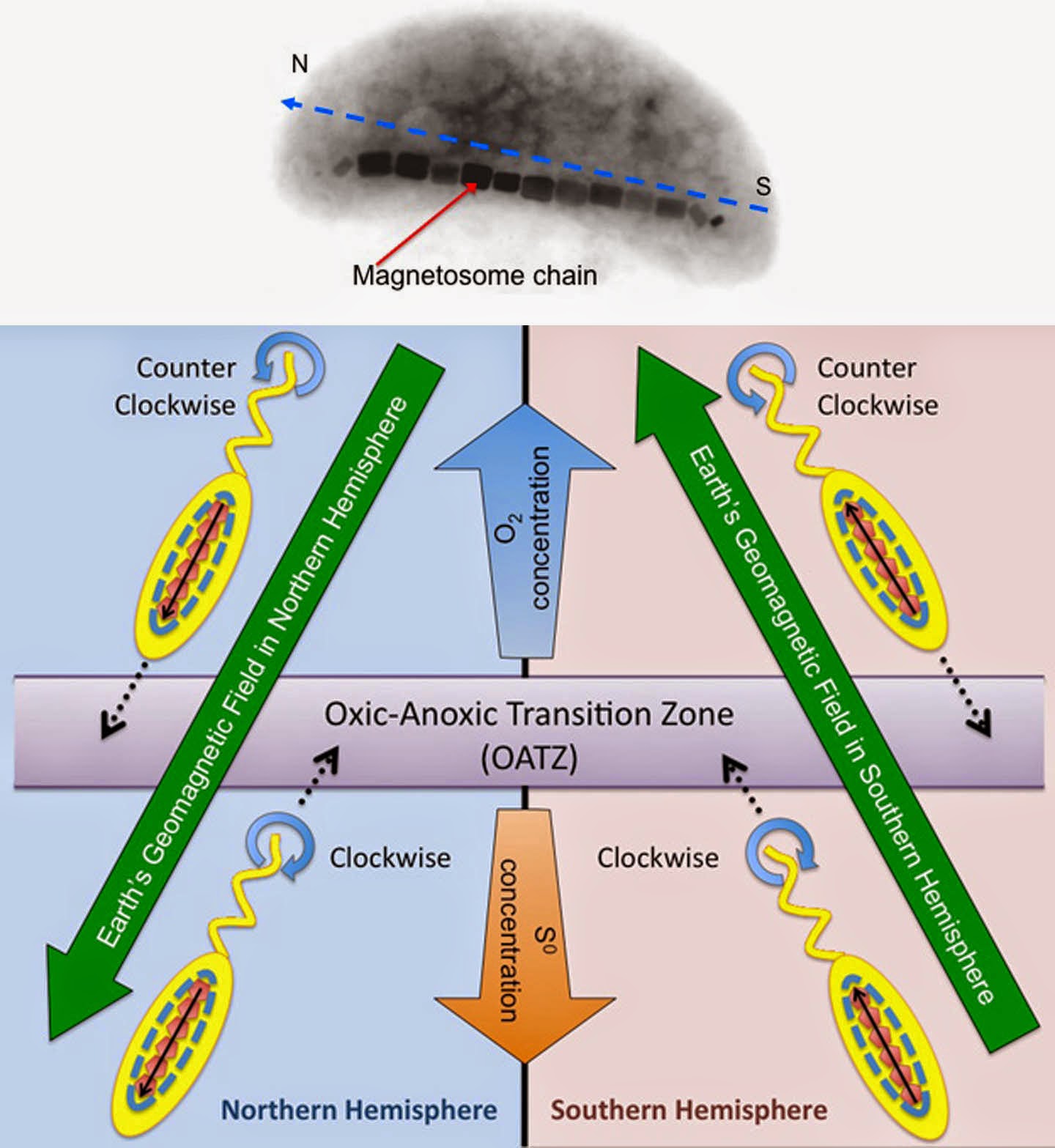 All the known magnetotactic bacteria, including all the coccal examples, are flagellated; therefore, it must be important for them to be motile. What’s the point of lining up with magnetic field lines if you just sit there, it should be involved in helping you get somewhere faster or better or putting you in a position to take advantage of something - so they’re all flagellated. The current hypothesis is that lining up with the field takes one plane of movement decision away from them, so they can move quickly toward food or oxygen. Sounds plausible.