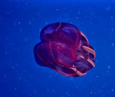 The comb jellies look round at first glance, but their architecture is a bit more complex than the cnidarian jellyfish. They have internal and external features that allow only for two planes of symmetry that give mirror images (see picture). These especially include the combs, rows of fused cilia that line their sides, and the fact that they don’t have stinging cells (cnidocytes). Remember that ONLY cnidarians have cnidocytes.