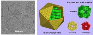 The most studied of the microcompartments is the carboxysome. This hollow shell, first described as far back as 1956, holds enzymes (RuBisCo, see When Amazing Isn’t Enough) that many prokaryotes use for carbon fixation. Photosynthesis is the most obvious type of carbon fixation, where carbon in a gas form (CO2) is converted to carbon in an organic, solid form (carbohydrates).