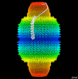 Each face of the shell is made up of a two dimensional polymer of protein hexagons. However, as architects will tell you, this is a difficult shape to close using only hexagons, even with 10,000 of them, like the typical carboxysome has. Soccer balls and the dome at the Epcot Center use strategically placed pentagonal faces that allow for the turning of the hexagonal faces and a closing of the compartment (see cartoon above).